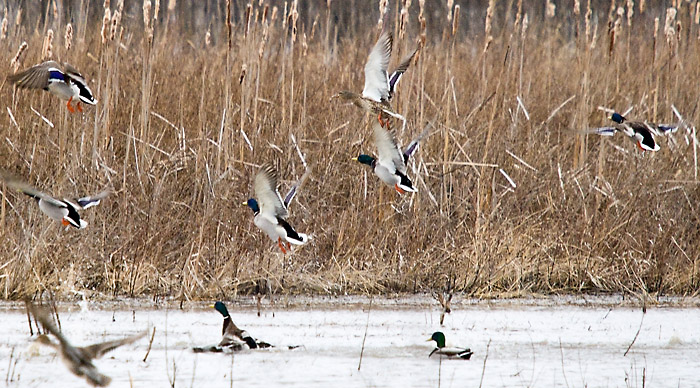 Mallards getting skittish at Spring Lake First up was a stop at Spring Lake, where there was a significant amount of wetland habitat set up specifically for migrating ducks. In the above image, a large cluster of Mallards were acting rather skittish as they looked around for any disturbance.
