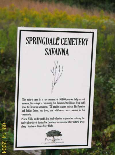 Springdale Cemetery SavannaThanks for Your Help!The Savanna at Springdale Cemetery in Peoria is a native remnant of the tallgrass oak savanna that once covered Illinois River bluffs prior to European settlement - and the only such remnant located within the city of Peoria. In 2006, the Peoria Audubon Board was informed that Springdale Cemetery Management Authority had considered converting the savanna to burial plots. The Peoria Audubon Board went on record to the Cemetery Authority asking that the savanna be maintained in its natural state rather than converting it to burial plots. Letter to Cemetery Authority: